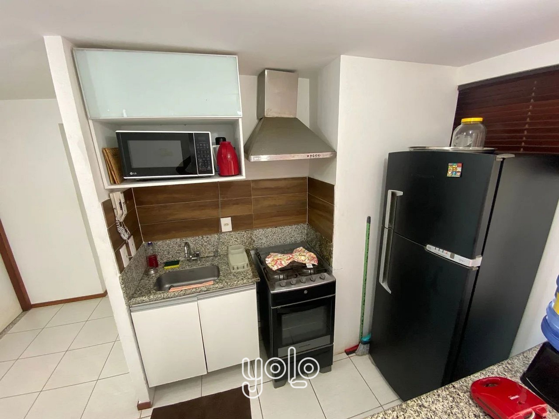 - Cozinha equipada com geladeira, micro-ondas, fogão e utensílios básicos.