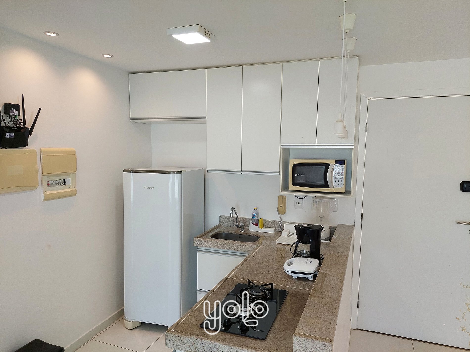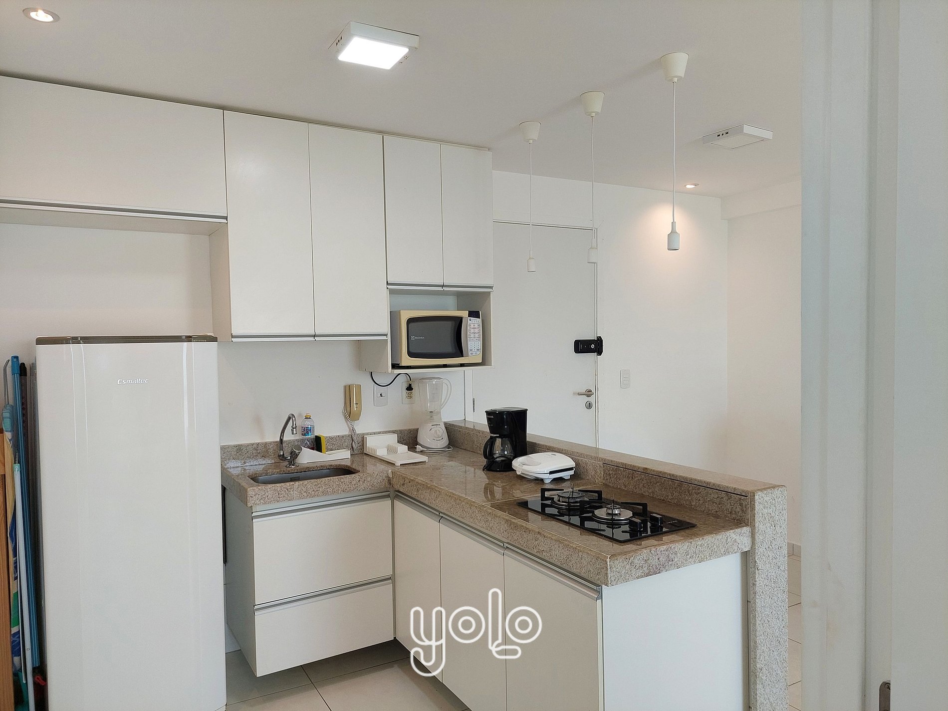 * Cozinha compacta equipada com geladeira, fogão, micro-ondas, liquidificador, sanduicheira , cafeteira e utensílios como panelas, copos, e pratos