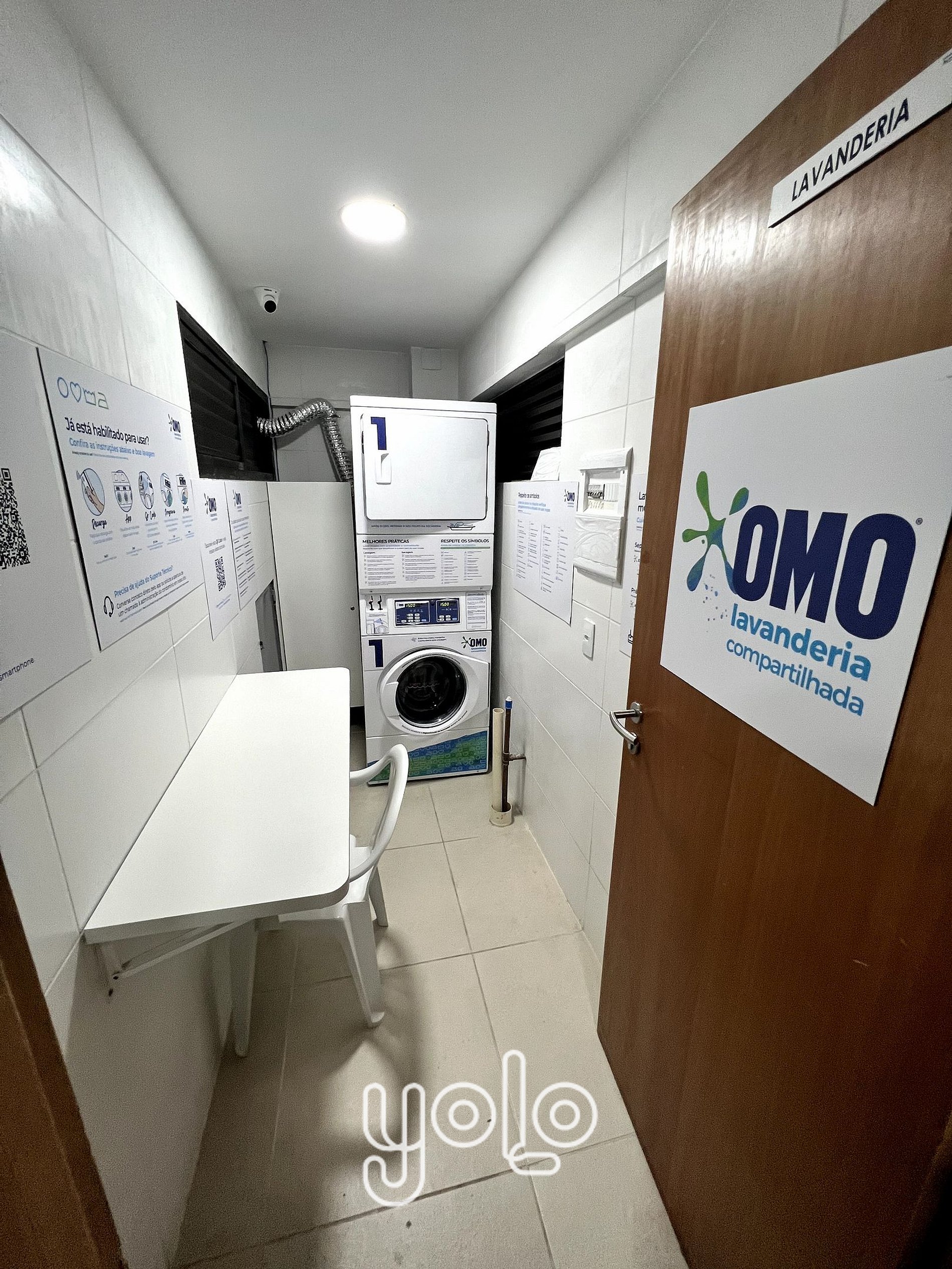 * Lavanderia self-service no terraço (APP “Omo Lavanderia” com instruções no local)