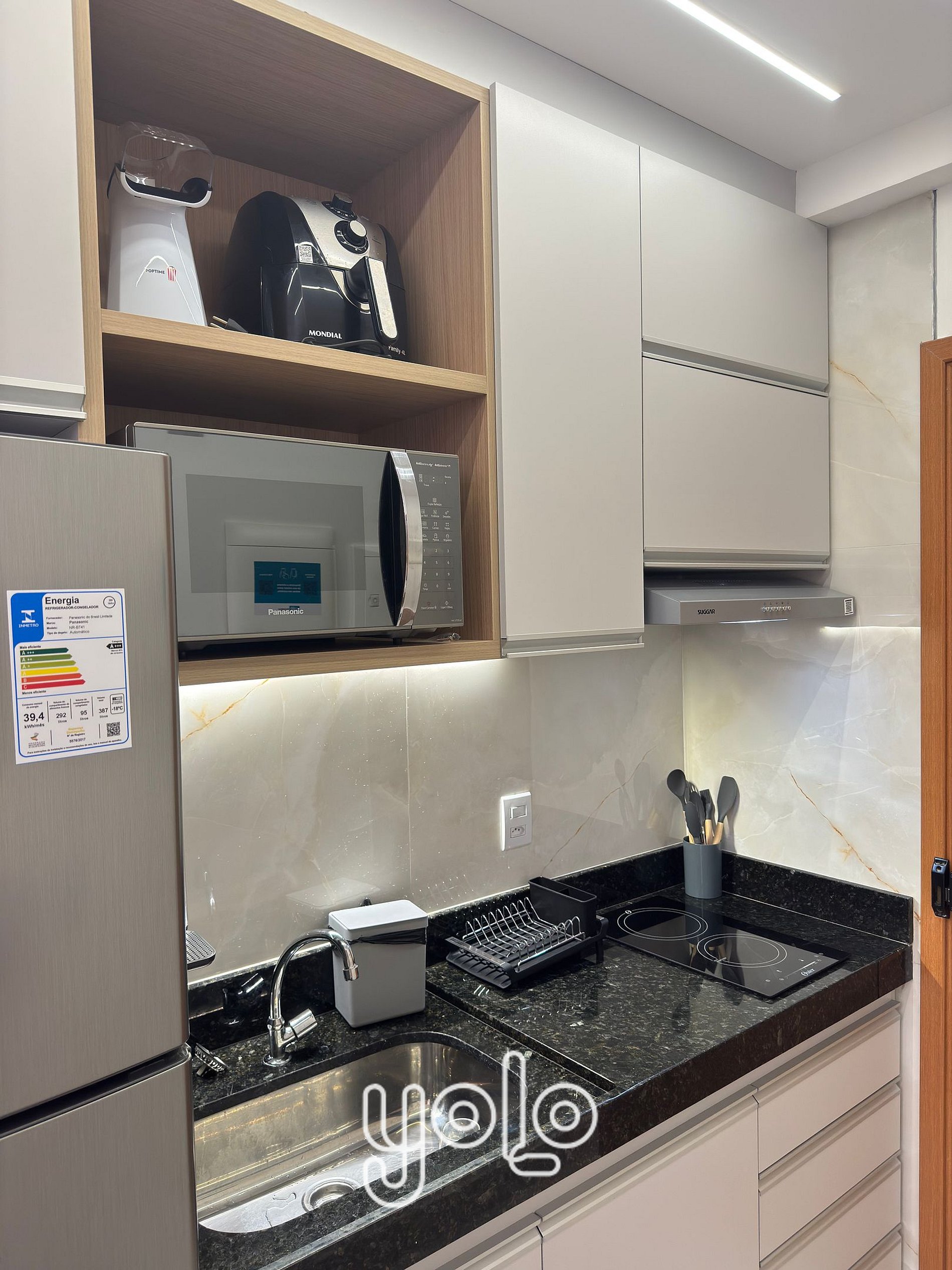 - Cozinha equipada com utensílios básicos: Geladeira , Cooktop indução, Microondas, Liquidificador, Airfyier, Sanduicheira, Cafeteira, Gelágua / Filtro, pratos, talheres e copos,e abridor de vinho.