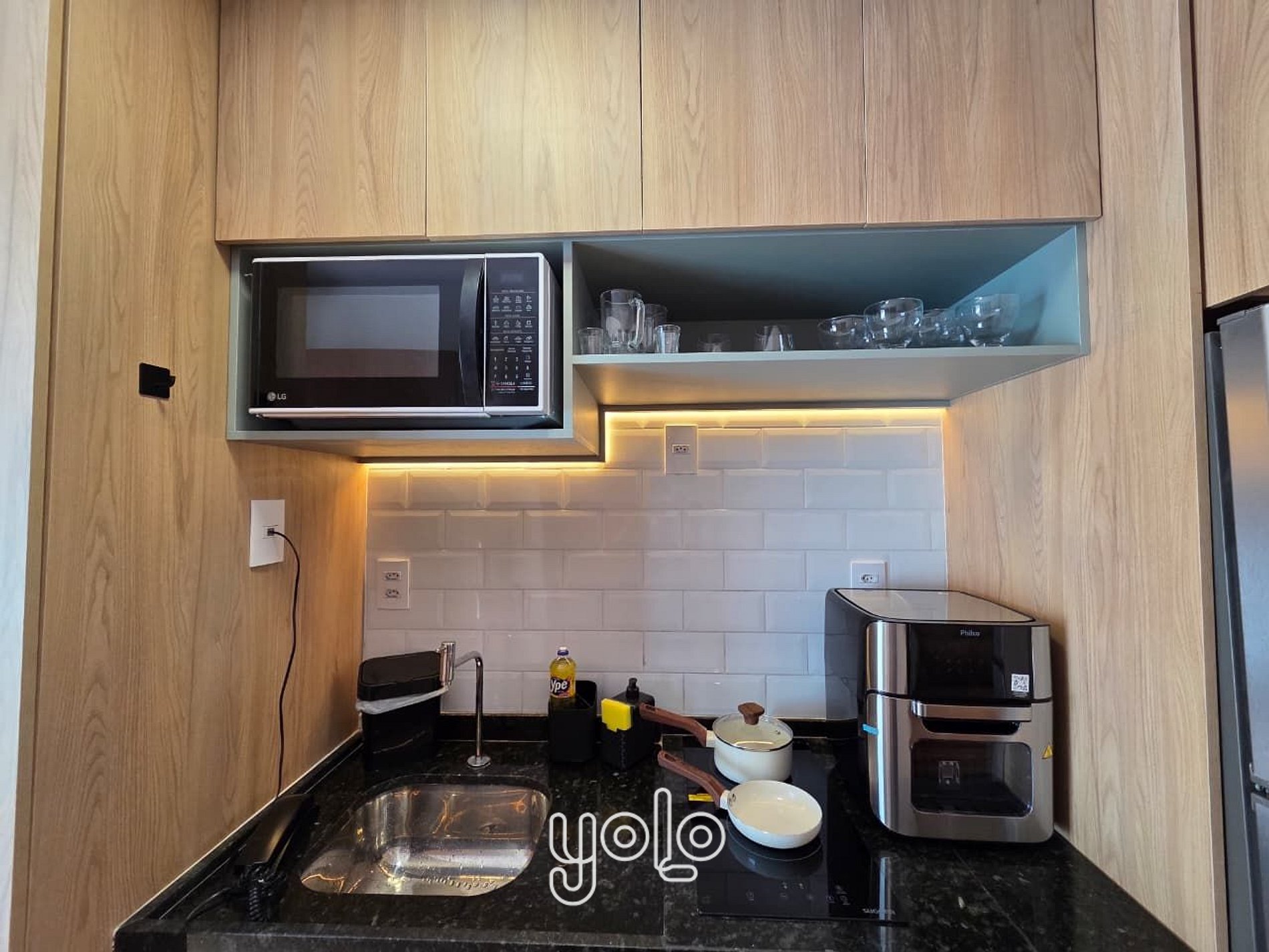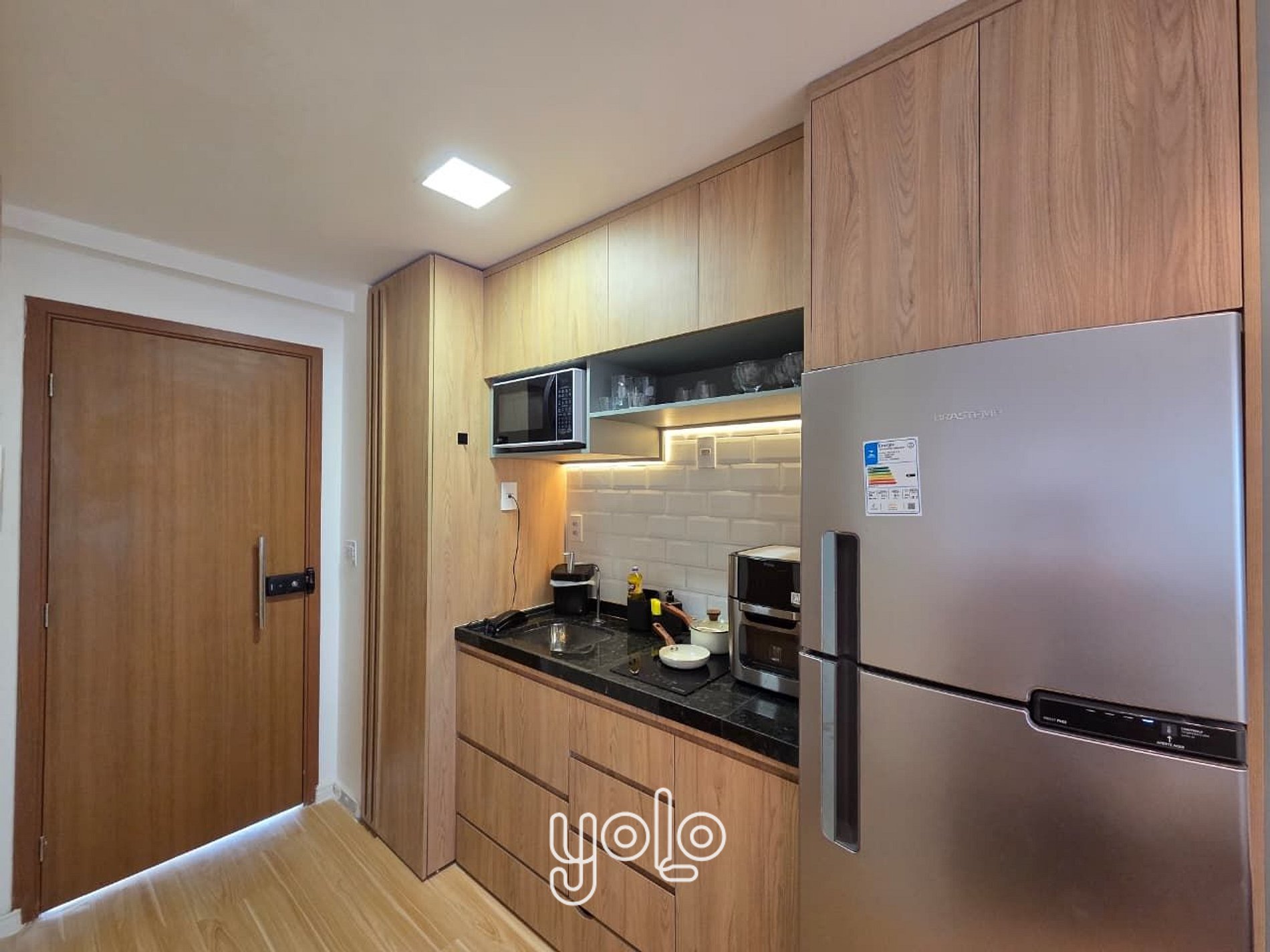 Cozinha equipada com geladeira, micro-ondas, cafeteira, cooktop e utensílios básicos