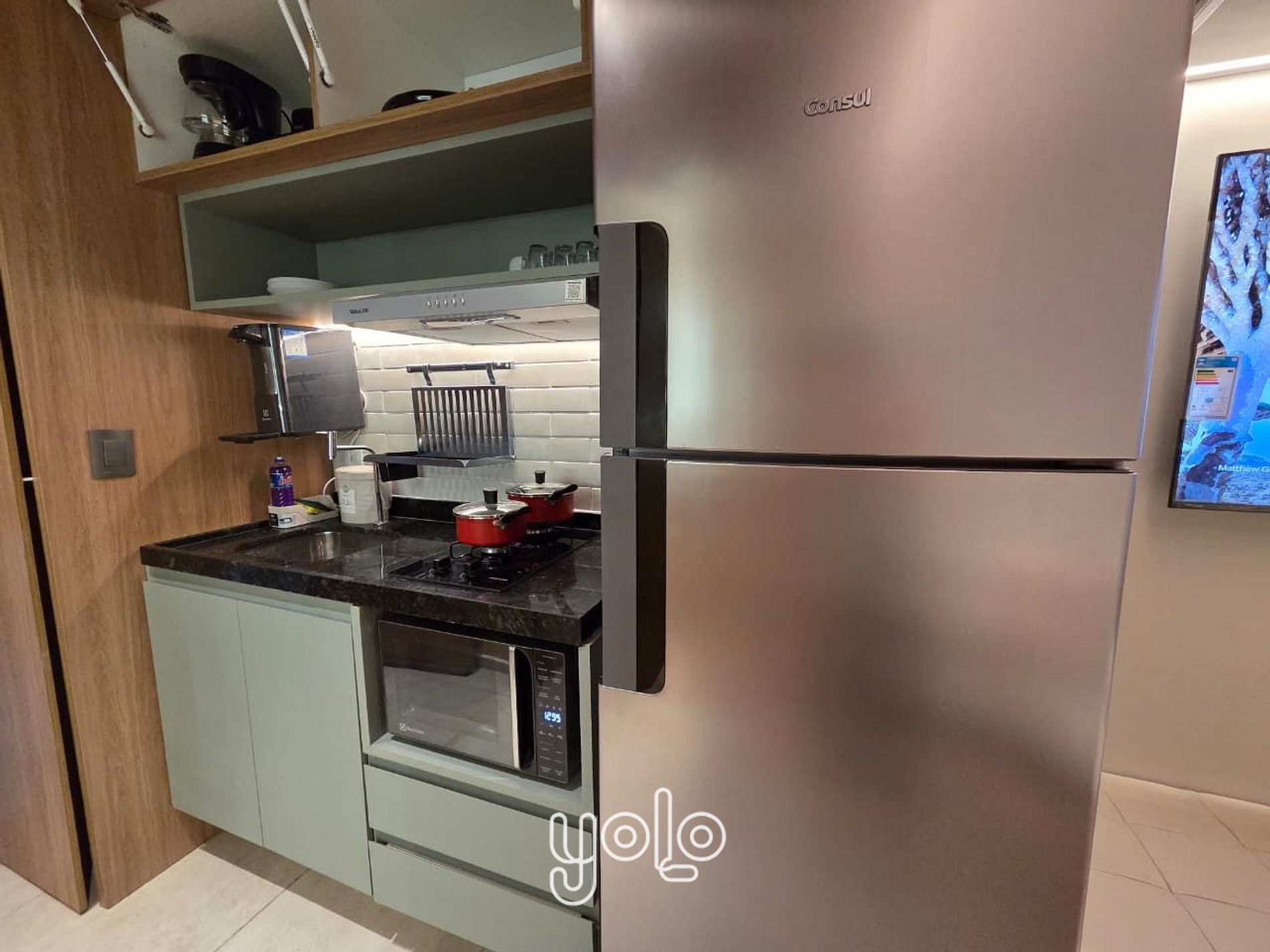 Cozinha equipada com geladeira, micro-ondas, cafeteira, cooktop e utensílios básicos