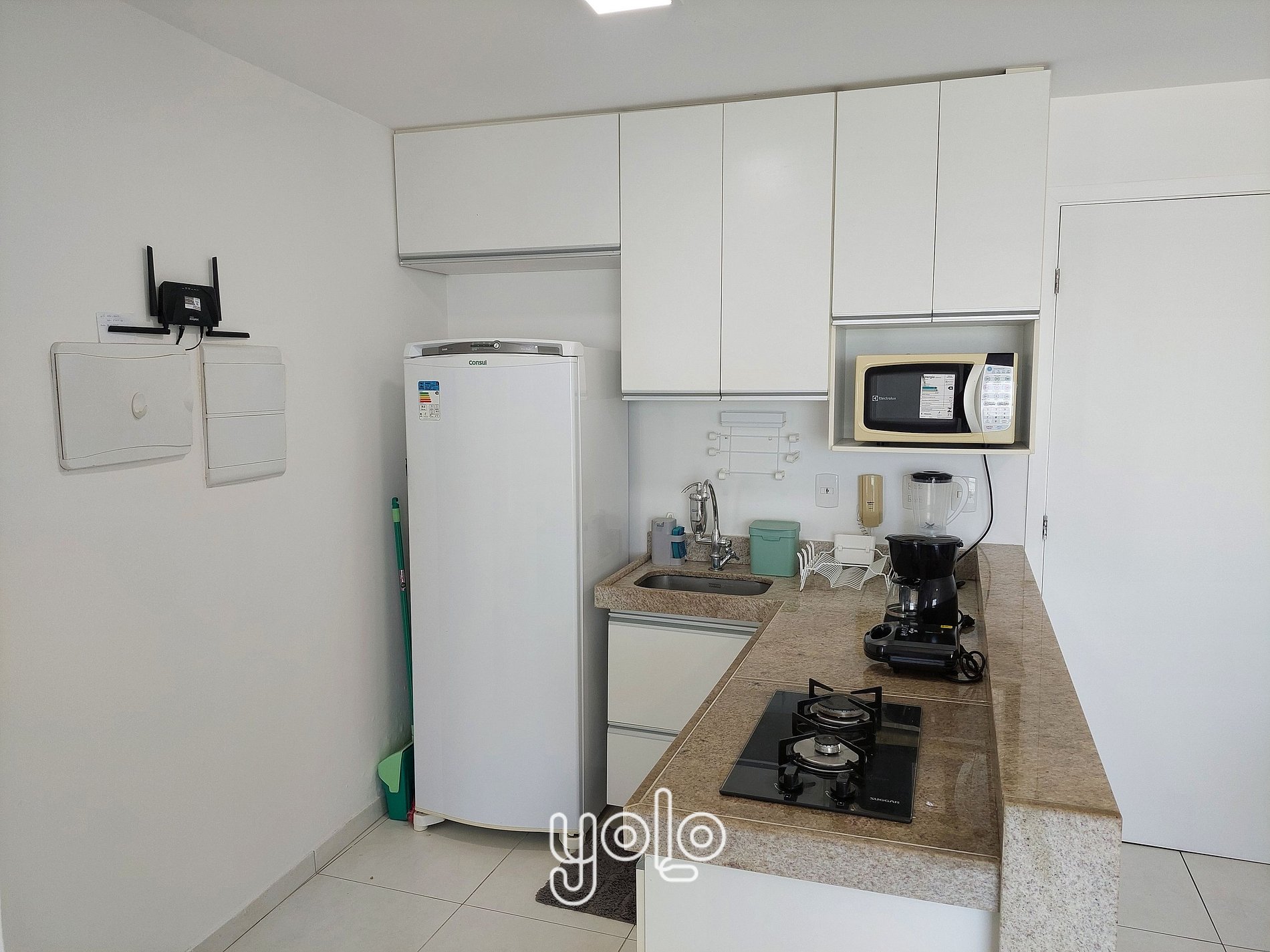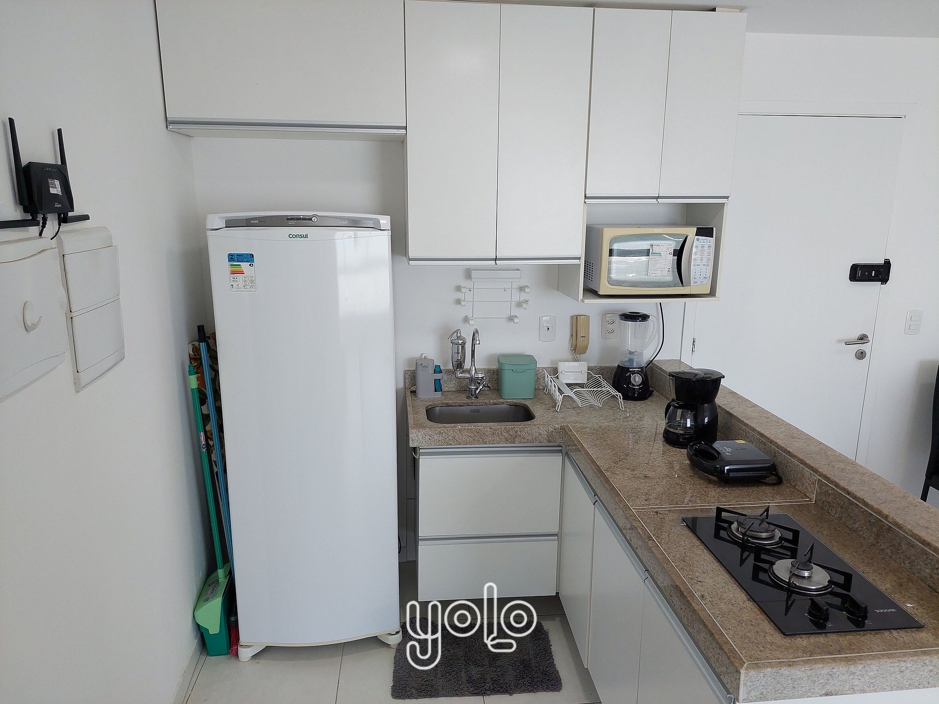 * Cozinha compacta equipada com geladeira, fogão, micro-ondas, liquidificador, sanduicheira , cafeteira e utensílios como panelas, copos, e pratos
