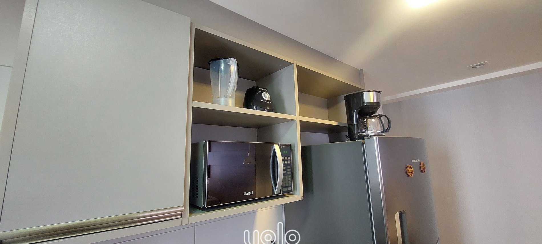 Cozinha equipada com utensílios e eletros (microondas, liquidificador, sanduicheira, fogão, forno e geladeira);