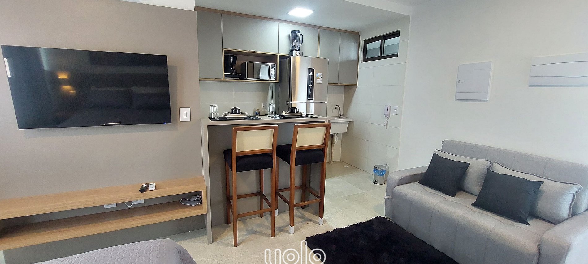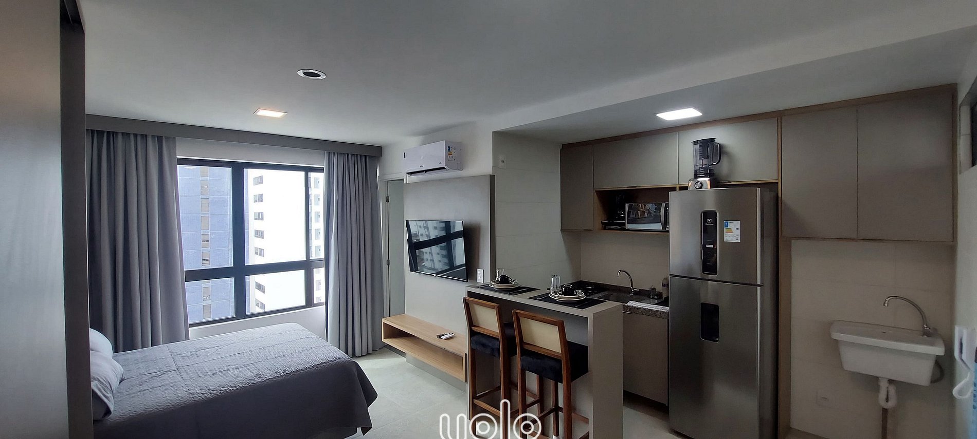 O studio acomoda até três pessoas com total conforto. Conta com cama de casal, sofá-cama, ar-condicionado, TV, Wi-Fi, e um banheiro privativo. A cozinha, conta com cooktop, micro-ondas, cafeteira, geladeira, louças, talheres e panelas. O flat também possui roupas de cama e banho, ferro de passar, secador de cabelo, espelho e armário.